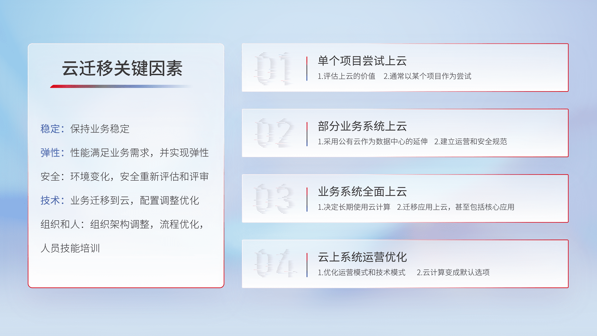 结合实际业务,,,,从规划设计、、、、云平台选型、、、、云原生改造、、、、数据迁移、、集成交付,,,,迁移全过程为客户识别最佳上云路径,,做好风险识别管理,,设计网络架构、、身份权限、、安全审计合规、、、、操作审计、、日志审计、、、、监控告警策略、、、、多站点容灾设计等,,,对云上基础设施进行整体规划,,提升IT治理水平,,,,以满足弹性、、高可用、、高性能的需求。。。。